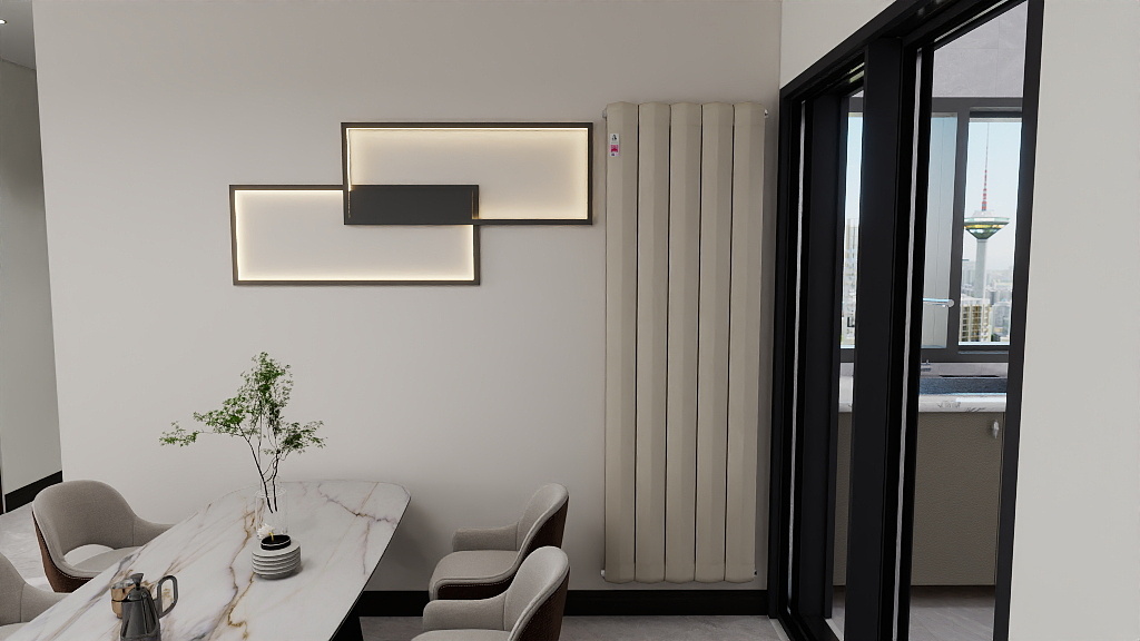 热水流经散热器,铝制翅片/钢制板体通过热辐射+对流释放热量;